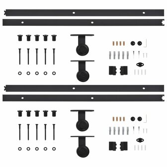 De levering bevat 4 schuifrails, 4 rollers, 4 deurstoppen, 2 vloergeleiders, 4 blokken tegen opspringen, 10 bevestigingsklemmen en andere noodzakelijke onderdelen. Opmerking: De deur is niet inbegrepen.