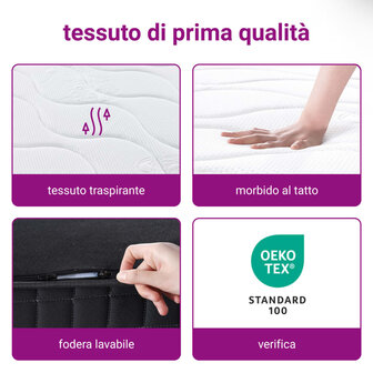 • Verbeterd comfort: de pocketveringmatras is ontworpen met meerdere lagen, waaronder een schuimlaag, een isolatiekussenlaag en een verende laag. Deze combinatie zorgt voor een zacht tot middelhard gevoel en wiegend comfort voor alle slaapposities. Bovendien absorbeert het matras effectief geluid en trillingen veroorzaakt door woelen en draaien, waardoor een rustige en ongestoorde slaap wordt gegarandeerd.
