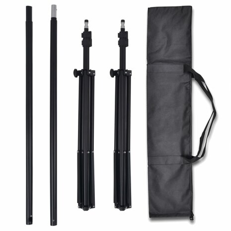 De levering bevat 2 standaarden, 2 middenstangdelen, 3 achtergronden en 1 draagtas.