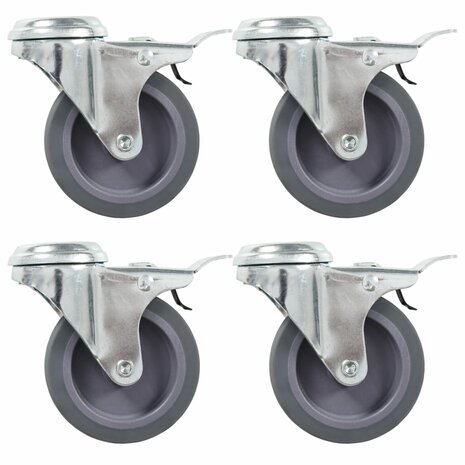 De levering bevat 4 zwenkwielen met boutgaten en dubbele remmen.
